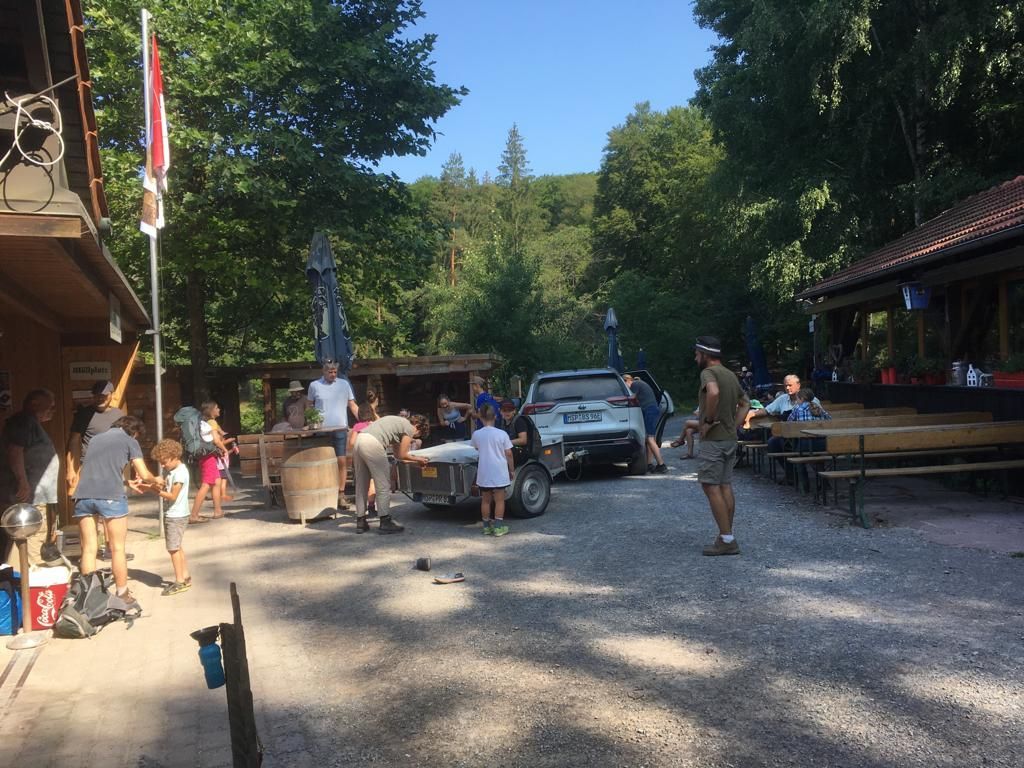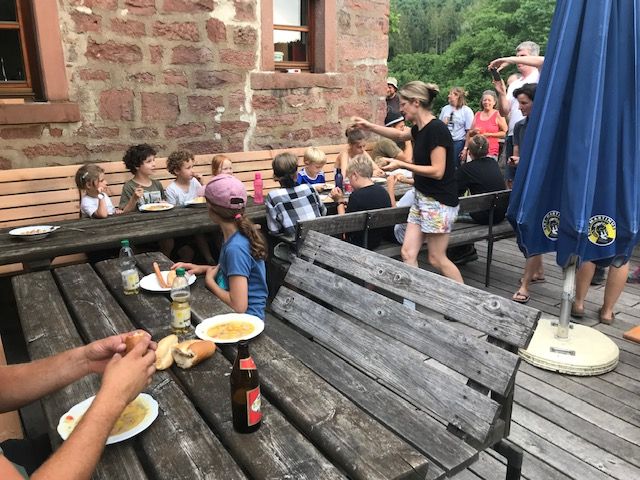 Das gefühlt heißeste Wochenende des Jahres nutzten die Wandermäuse des Wandervereins Schollbrunn für ihre Erlebnis-Trekkingtour zur DAV-Hütte am Forsthaus Sylvan. Bei traumhaftem Wetter trafen sich 22 Wandermäuse mit Eltern und/oder Großeltern am Dreimärker in Schollbrunn zur gemeinsamen Fahrt zum Schleiftor. Von dort ging es mit Rucksäcken durch schöne kühle Wälder und Wiesen zum Sylvan. Die auf dem Weg zu lösenden Suchaufgaben für die Wandermäuse sorgten dafür, dass keine Langeweile bei der großen Gruppe aufkam. Nach der Ankunft an der Hütte wurden erst einmal die Nachtquartiere im Matratzenlager für die 31 über Nacht bleibenden bezogen, dann der nahe Bach erkundet und das feuchte Nass genossen. Danach ging es gemeinsam an das Gemüseschnippeln für das Abendessen. Das Ergebnis, eine dicke Gemüsesuppe mit Wursteinlage und Brötchen, wurde von der mittlerweile auf 42 Teilnehmer angewachsenen Gruppe sehr gelobt. Auch kalte Wienerwürstchen waren zusätzlich im Angebot. Selbstverständlich gab es gekühlte Getränke für Jung und Alt. Nach dem gemeinsamen Abendessen, dem Abräumen und Spülen war wieder Freizeit angesagt.