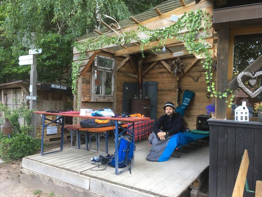 Hier wurden, nachdem die Zelte fürs Nachtquartier aufgebaut waren, der traumhaft angelegte Spielplatz und der Eisenbahnwaggon erkundet. Der große Kühlschrank in der Servicestation wurde mit Getränken und Lebensmitteln für die mittlerweile auf 14 Wandermäuse und 7 Erwachsene angewachsene Truppe gefüllt.